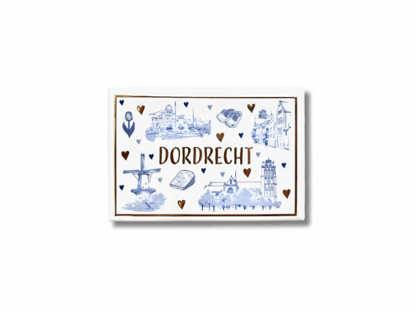 Magneet Dordrecht – blauw-wit: een magneet met blauwwitte tekeningen van Dordtse monumenten en goud accenten. Leuk voor op de koelkast!