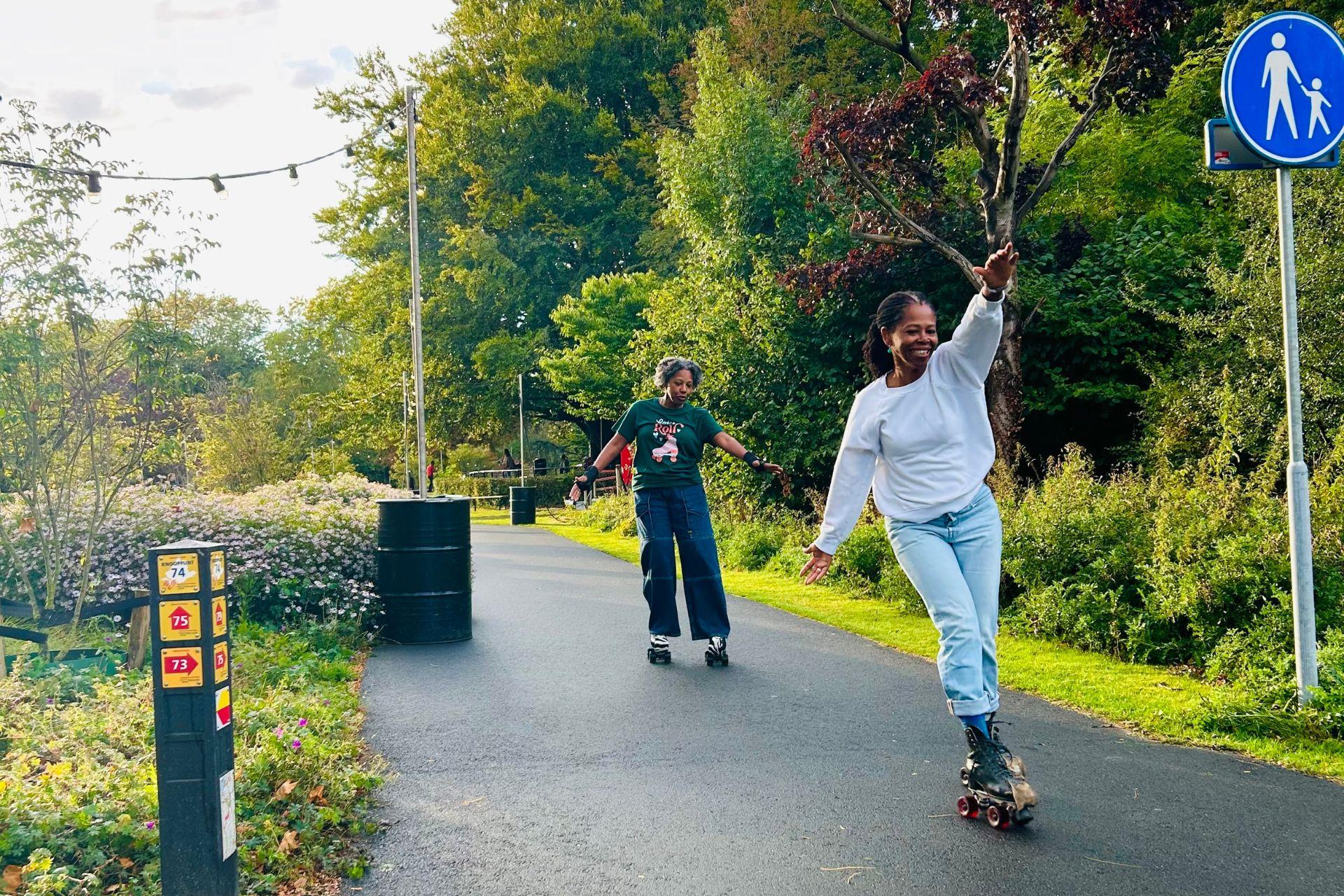 Ook zijn er gratis rolschaatsen die je kunt lenen als je zelf niets heb om mee door het park te rollen.